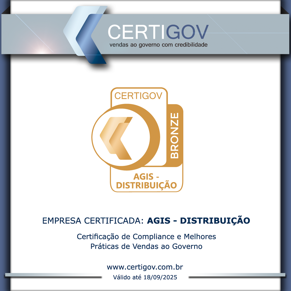 O Selo de compliance Certigov garante a integridade, a conformidade da empresa e a qualifica a vender ao governo com segurança. A Agis conquistou certificação de transparência CertiGov, na classe bronze, até 18/09/2025.